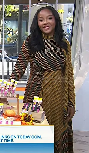 Makho Ndlovu on Today on NBC was spotted wearing this mixed stripe scarf dress on Today on Oct 24 2025's episode. Makho's Dress is the Noven Striped Mock-Turtleneck Midi-Dress by Ronny Kobo.