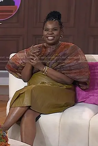 on Today on NBC was spotted wearing this printed pleated top and leather skirt on Today on Oct 24 2025's episode. 's Bodysuit is the Sombra Puff Sleeve Bodysuit in Kava Print by Andrea Iyamah . 's Skirt is the Tracy Skirt in Saddle by A.L.C..