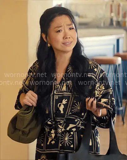 Ashley (played by Sherry Cola) on Nobody Wants This on Netflix was spotted wearing this black and white printed shirt and pants set on Nobody Wants This on episode 'When You Know, You Know' (2x07) in Oct 2025. Ashley's Top is the Vally printed silk top by Nanushka . Ashley's Pants is the Brenda silk trousers by Nanushka . Ashley's Bag is the Medium Hana Tote in Dark Olive by JW Pei.