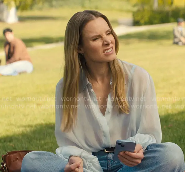 Joanne (played by Kristen Bell) on Nobody Wants This on Netflix was spotted wearing this sheer blue blouse on Nobody Wants This on episode 'A Better Rabbi' (2x08) in Oct 2025. Joanne's Top is the Ilia Balloon Sleeve Blouse in Pale Blue Silk Chiffon by Kallmeyer . Joanne's Belt is the Benny suede belt by Khaite . Joanne's Shoes is the Stella Sneaker In Russet Suede and Ivory Leather by Larroude . Joanne's Bag is the Farrow Mini Bag in Natural Heritage by Sezane.