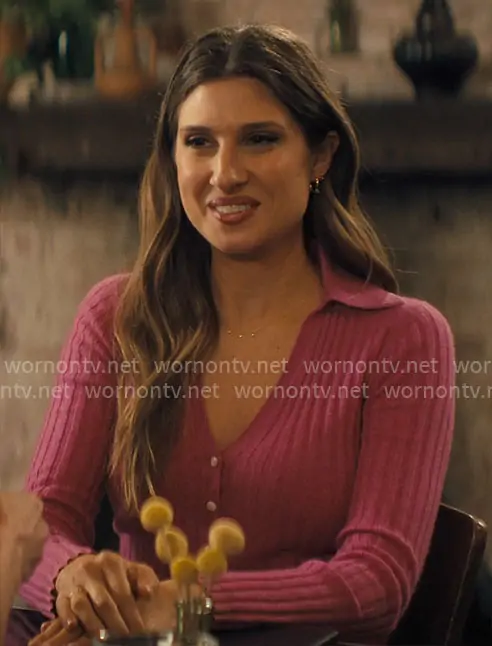 Rebecca (played by Emily Arlook) on Nobody Wants This on Netflix was spotted wearing this pink ribbed cardigan top on Nobody Wants This on episode 'A Better Rabbi' (2x08) in Oct 2025. Rebecca's Sweater is the Rib Button Cardigan in Fucshia by Guest in Residence.