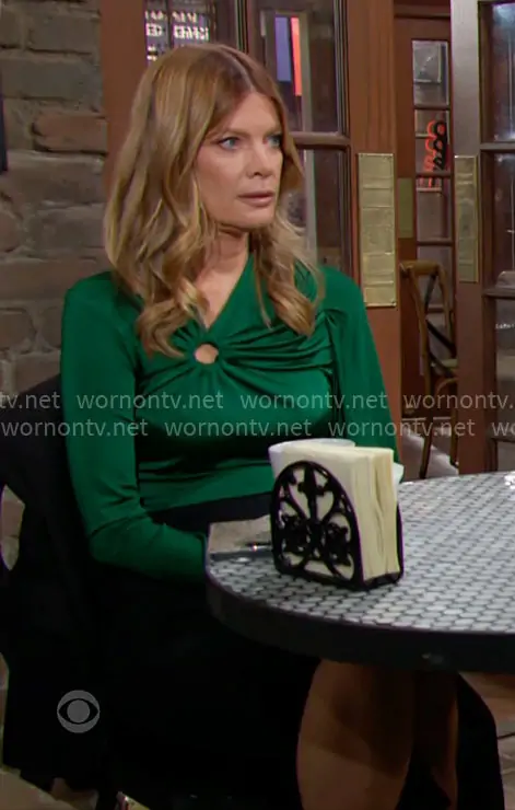 Phyllis Summers (played by Michelle Stafford) on The Young and the Restless on CBS was spotted wearing this green ring cutout top on The Young and the Restless on Oct 27 2025's episode. Phyllis's Top is the Gathered Circle Detail Top by Victoria Beckham .