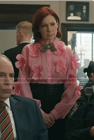 Elsbeth Tascioni (played by Carrie Preston) on Elsbeth on CBS was spotted wearing this pink floral applique blouse on Elsbeth on episode 'Good Grief' (3x03) in Oct 2025. Elsbeth's Top is the Jinan Blouse by My Name Is Rasha .
