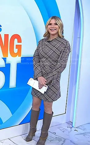 Jenna Bush Hager on Today on NBC was spotted wearing this plaid mini dress and chain boots on Today on Oct 27 2025's episode. Jenna's Dress is the Harpor Satin Long-Sleeve Mini Dress by Simkhai . Jenna's Shoes is the Tarian Knee High Boot in Bark by Veronica Beard.