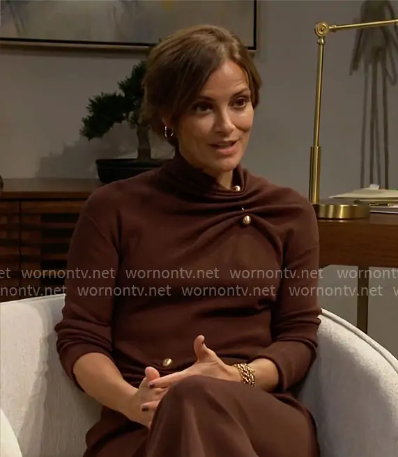 Taylor Hayes (played by Rebecca Budig) on The Bold and the Beautiful on CBS was spotted wearing this brown gathered detail dress on The Bold and the Beautiful on Oct 27 2025's episode. Taylor's Dress is the Vera Dress in Java by Cult Gaia .