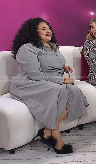 on Today on NBC was spotted wearing this grey plaid shirt on Today on Oct 27 2025's episode. 's Dress is the Plus Long Sleeve Plaid Shirt Dress by Ashley Graham.
