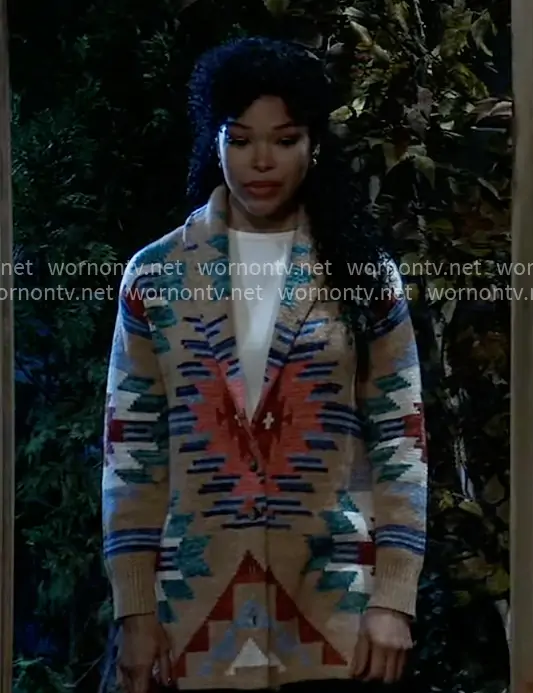 Portia Robinson (played by Brook Kerr) on General Hospital on ABC was spotted wearing this printed cardigan on General Hospital on Oct 27 2025's episode. Portia's Sweater is the Southwest Cardigan by Lucky Brand .