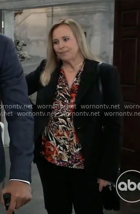 Laura Collins (played by Genie Francis) on General Hospital on ABC was spotted wearing this floral blouse and black blazer on General Hospital on Oct 27 2025's episode. Laura's Top is the Lola Silk Blouse by Kobi Halperin . Laura's Jacket is the Dylan Blazer by Kobi Halperin .