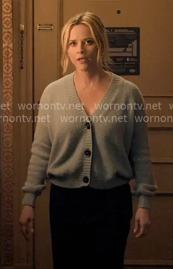 Bradley Jackson (played by Reese Witherspoon) on The Morning Show on Apple TV was spotted wearing this blue v-neck cardigan on The Morning Show on episode 'Person of Interest' (4x07) in Oct 2025. Bradley's Sweater is the Dodo Cardigan by Weekend Max Mara.