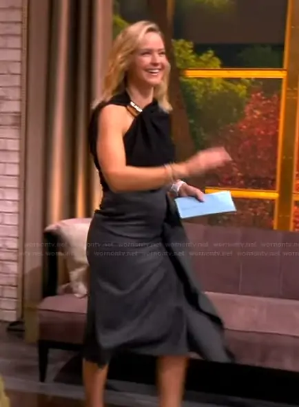 Sara Haines on The View on ABC was spotted wearing this black one shoulder top and gray skirt on The View on Oct 29 2025's episode. Sara's Top is the Malika Draped Short-Sleeve Top by Proenza Schouler . Sara's Skirt is the Amery Skirt by Proenza Schouler.