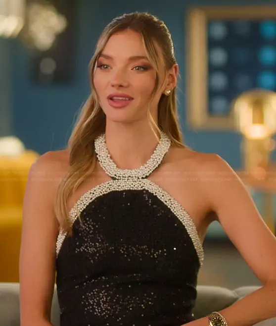 Alanna Gold on Selling Sunset on Netflix was spotted wearing this black confessional mini dress on Selling Sunset on episode 'Gossip Girls' (9x01) in Oct 2025. Alanna's Dress is the Faux-Pearl-Trim Sequined Bouclé Minidress by Self Portrait.