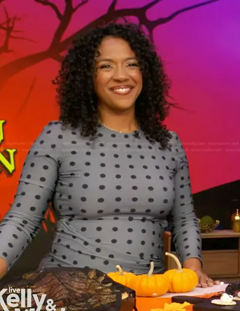 on Live with Kelly and Mark on Disney ABC Home Entertainment was spotted wearing this polka dot print dress on Live with Kelly and Mark on Oct 29 2025's episode. 's Dress is the Polka Dot Draped Pencil Dress by Arias New York.