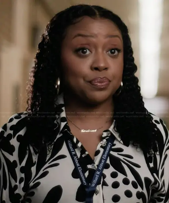 Janine Teagues (played by Quinta Brunson) on Abbott Elementary on ABC was spotted wearing this floral print midi dress on Abbott Elementary on episode 'Camping' (5x05) in Oct 2025. Janine's Dress is the Tie-belt Shirt Dress by H&M.