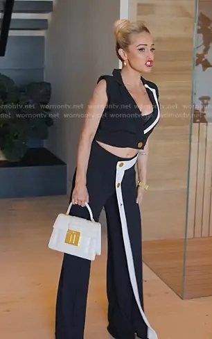 Mary Fitzgerald on Selling Sunset on Netflix was spotted wearing this black contrast trim crop top and pants on Selling Sunset on episode 'Girlsgiving' (9x02) in Oct 2025. Mary's Set is the Amelia Vest Pant Set by Fashion Nova . Mary's Bag is the Leather Top Handle Bag by Tom Ford.