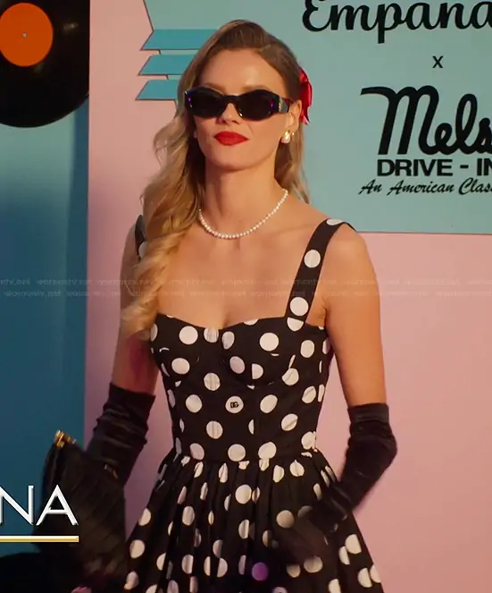 Alanna Gold on Selling Sunset on Netflix was spotted wearing this black polka dot print dress on Selling Sunset on episode 'Too Far Gone' (9x03) in Oct 2025. Alanna's Dress is the Polka Dot Stretch Cotton Corset Sundress by Dolce and Gabbana.