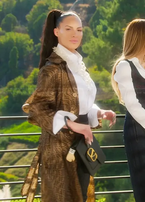 Amanza Smith on Selling Sunset on Netflix was spotted wearing this monogram logo coat on Selling Sunset on episode 'Too Far Gone' (9x03) in Oct 2025. Amanza's Coat is the Organza FF Vertigo Trench Coat by Fendi . Amanza's Bag is the Vain Bag With Handle In Shiny Calfskin by Valentino.
