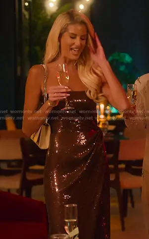 Emma Hernan on Selling Sunset on Netflix was spotted wearing this brown sequin strapless gown on Selling Sunset on episode 'Girlsgiving' (9x02) in Oct 2025. Emma's Dress is the Twisted Sequined Strapless Gown in Chocolate by Alex Perry . Emma's Bag is the Grain de Poudre Monogram Kate Medium Shoulder Bag by Saint Laurent.