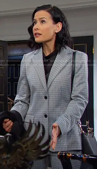 Amy Choi (played by Shi Ne Nielson) on Days of our Lives on Peacock was spotted wearing this blue check blazer and pants on Days of our Lives on Oct 31 2025's episode. 's Jacket is the Two-Button Blazer in Fog Multi by Theory . 's Pants is the High-Waisted Taper Pants in Fog Multi by Theory.