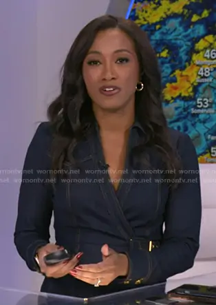 Brittany Bell on Good Morning America on ABC was spotted wearing this denim wrap dress on Good Morning America on Oct 30 2025's episode. Brittany's Dress is the Arlington Denim Midi-Dress by Veronica Beard.