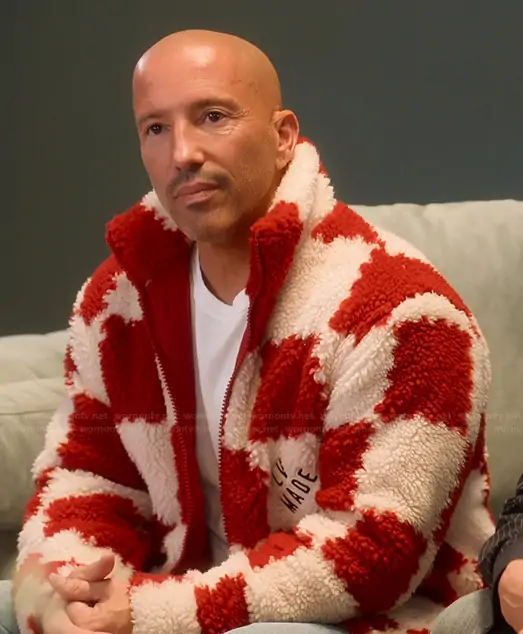 Jason Oppenheim on Selling Sunset on Netflix was spotted wearing this red check sherpa jacket on Selling Sunset on episode 'One Less Agent, One New Boyfriend' (9x04) in Oct 2025. Jason's Jacket is the X Nigo Jacquard Damier Fleece Blouson by Louis Vuiton.