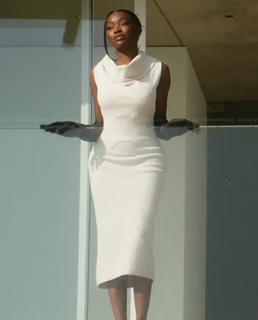 Chelsea Lazkani on Selling Sunset on Netflix was spotted wearing this white knit drape dress on Selling Sunset on episode 'One Less Agent, One New Boyfriend' (9x04) in Oct 2025. Chelsea's Dress is the Cotton-blend bouclé midi dress by Magda Butrym.