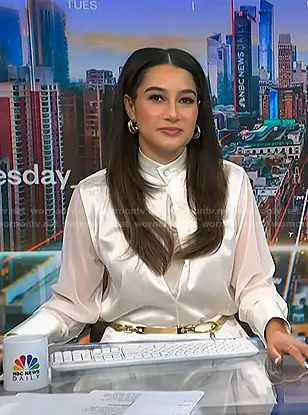 Morgan Radford on NBC News Daily on NBC was spotted wearing this white band collar shirt on NBC News Daily on Oct 30 2025's episode. Morgan's Top is the Silk Charmeuse Cowlneck Shirt in Ivory by Helmut Lang.