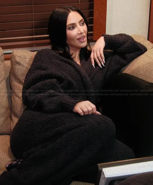 Kim Kardashian (played by Kim Kardashian) on The Kardashians on Hulu was spotted wearing this black teddy robe on The Kardashians on episode 'She Was Such a Hater' (7x02) in Oct 2025. Kim's Robe is the Cozy Knit Robe by Skims.