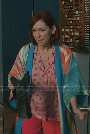 Elsbeth Tascioni (played by Carrie Preston) on Elsbeth on CBS was spotted wearing this pink strawberry print pajama and robe on Elsbeth on episode 'Ick, a Bod' (3x04) in Oct 2025. Elsbeth's Pajama Set is the Short Sleeve Boxer Pajama Set in Painterly Strawberries by Kate Spade . Elsbeth's Robe is the Usami Robe in Multi by Natori.