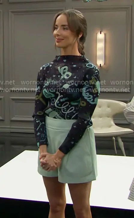 Ivy Forrester (played by Ashleigh Brewer) on The Bold and the Beautiful on CBS was spotted wearing this printed top and mint green leather shorts on The Bold and the Beautiful on Oct 31 2025's episode. Ivy's Top is the Interplanetary Print Pleated Funnel Neck Top by Issey Miyake . Ivy's Shorts is the Faux Leather Tailored Short in Rain by Susana Monaco .