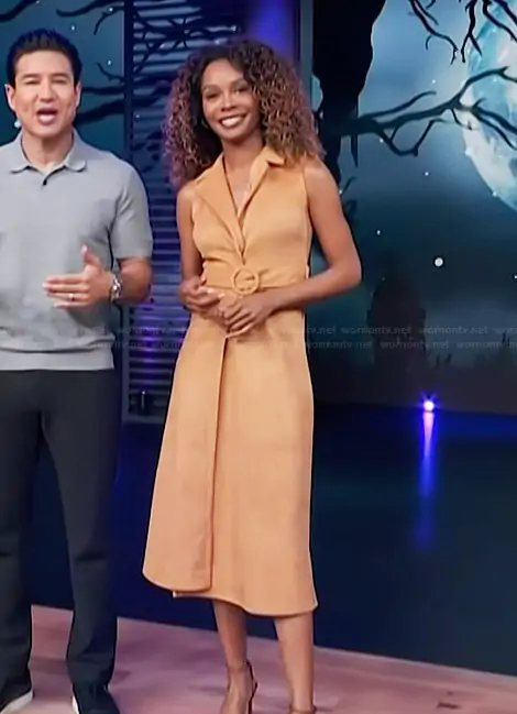 Zuri Hall on Access Hollywood on NBC was spotted wearing this beige suede wrap dress on Access Hollywood on Oct 31 2025's episode. Zuri's Dress is the Faux-Suede Sleeveless Jacket Midi Dress by Rosie Harlow.
