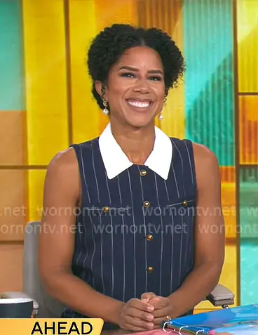 Adriana Diaz on CBS Mornings on CBS was spotted wearing this navy pinstripe dress on CBS Mornings on Oct 28 2025's episode. Adriana's Dress is the Dolla Mini Striped Dress by Sandro .