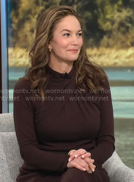 on CBS Mornings on CBS was spotted wearing this brown cross neck dress on CBS Mornings on Oct 30 2025's episode. 's Dress is the Twist Front Belted Sweater Dress by Donna Karan .