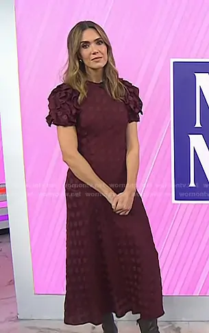 on Today on NBC was spotted wearing this burgundy embroidered dress on Today on Nov 03 2025's episode. 's Dress is the Elvia Ruffle Sleeve Midi Dress in Claret by Ulla Johnson.