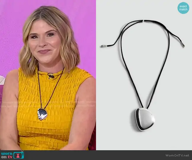 Jenna Bush Hager on Today on NBC was spotted wearing this silver pendant necklace on Today on Nov 03 2025's episode. Jenna's Necklace is the Pendant Necklace with Metal Component in Silver by Mango.