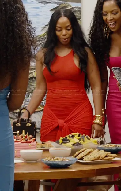 Keiarna Stewart on The Real Housewives of Potomac on Bravo was spotted wearing this red tie front dress on The Real Housewives of Potomac on episode 'Sunshine and Sexts' (10x05) in Nov 2025. Keiarna's Dress is the Semi Dress by Bananhot.