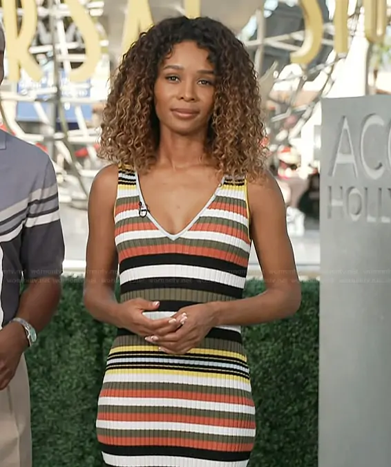 Zuri Hall on Access Hollywood on NBC was spotted wearing this striped v-neck dress on Access Hollywood on Nov 03 2025's episode. Zuri's Dress is the Bowie Striped V-Neck Midi-Dress by Toccin.