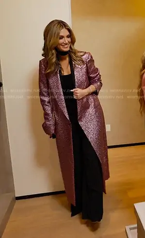 Delta Goodrem on Selling Sunset on Netflix was spotted wearing this pink metallic coat on Selling Sunset on episode 'Taking Out the Trash' (9x06) in Nov 2025. 's Coat is the Metallic Jacquard-crepon Coat by Dries Van Noten . 's Bag is the Boy Chanel Wallet on Chain by Chanel.