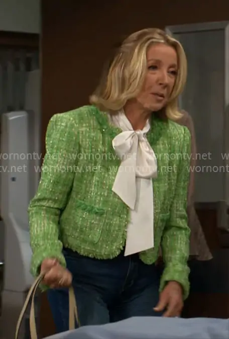 Nikki Reed Newman (played by Melody Thomas-Scott) on The Young and the Restless on CBS was spotted wearing this green tweed jacket on The Young and the Restless on Nov 03 2025's episode. Nikki's Jacket is the Lucie Boucle Audette Jacket by Cinq a Sept.