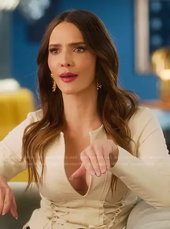 Sandra Vergara on Selling Sunset on Netflix was spotted wearing this beige lace-up confessional top on Selling Sunset on episode 'Taking Out the Trash' (9x06) in Nov 2025. Sandra's Top is the Valentina Lace Up Top by Marissa Webb . Sandra's Earrings is the Surrealist Eye Chandelier Earrings by Schiaparelli.