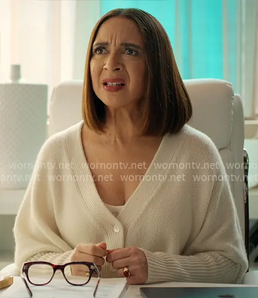 Molly Novak (played by Maya Rudolph) on Loot on Apple was spotted wearing this cream v-neck cardigan on Loot on episode 'Joyride' (3x05) in Nov 2025. Molly's Sweater is the Batwing Cashmere Cardigan by Co.