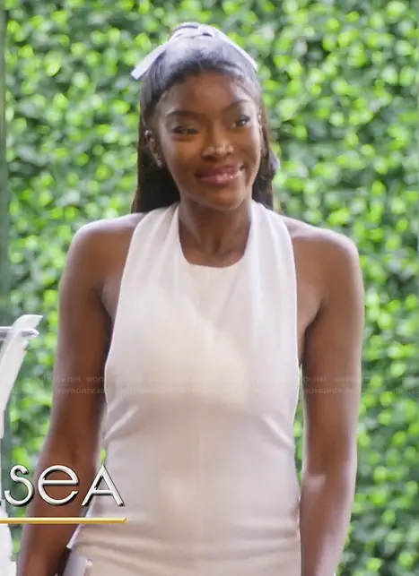 Chelsea Lazkani on Selling Sunset on Netflix was spotted wearing this white halter neck dress on Selling Sunset on episode 'A Diamond in the Rough' (9x07) in Nov 2025. Chelsea's Dress is the Favola Halter Backless Midi Dress by Jacquemus.