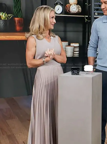 on Access Hollywood on NBC was spotted wearing this ribbed v-neck dress on Access Hollywood on Nov 04 2025's episode. 's Dress is the Fararan Pleated Mixed Media Maxi Dress by Boss.