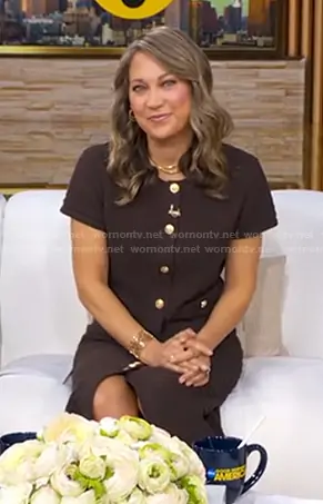 Ginger Zee on Good Morning America on ABC was spotted wearing this brown short sleeve cardigan and skirt on Good Morning America on Nov 04 2025's episode. Ginger's Sweater is the Short Sleeve Cotton Suiting Cardigan by Toccin . Ginger's Skirt is the Button Front Knit Midi Skirt by Toccin.