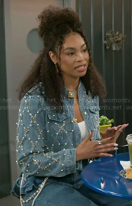 Chelsea Hamilton (played by RhonniRose Mantilla) on Beyond the Gates on CBS was spotted wearing this embellished denim jacket and ruffle detail jeans on Beyond the Gates on Nov 04 2025's episode. Chelsea's Jacket is the Leyana Embellished Denim Jacket by Nikki Lund . Chelsea's Pants is the Avery Ruffled High-Rise Wide-Leg Jeans by Aknvas . Chelsea's Earrings is the Teddy Bear hanging earrings by Moschino . Chelsea's Bag is the Kensington Leather Mini Crossbody Bag by Kurt Geiger.
