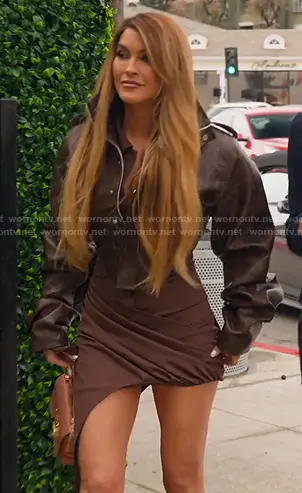 Chrishell Stause on Selling Sunset on Netflix was spotted wearing this Chrishell’s brown asymmetric dress and leather jacket on Selling Sunset on episode 'There's No Going Back' (9x09) in Nov 2025. Chrishell's Dress is the Diane Draped Asymmetric Mini Dress in Brown by Maniere de Voir . Chrishell's Jacket is the Solange Vintage Leather Tacked Sleeve Corset Jacket in Brown by Maniere de Voir . Chrishell's Bag is the Pink EPI Twist MM Bag by Louis Vuitton.