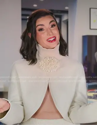 Bronwyn Newport on The Real Housewives of Salt Lake City on Bravo was spotted wearing this white confessional sweater on The Real Housewives of Salt Lake City on episode 'Loose Lips Sink Friend Ships' (6x08) in Nov 2025. Bronwyn's Sweater is the Cut-Out Cashmere-Blend Jumper by Alaia . Bronwyn's Choker is the Flower-Detailed Leather Choker by Alaia.