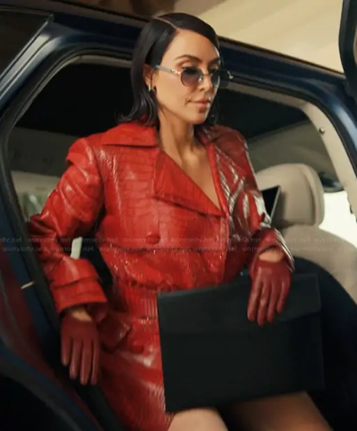 Allura Grant (played by Kim Kardashian) on Alls Fair on Hulu was spotted wearing this red crock leather jacket on Alls Fair on episode 'Pilot' (1x01) in Nov 2025. Allura's Coat is the 2008 Fall Collection by Jean Paul Gaultier . Allura's Sunglasses is the CT0439S by Cartier.