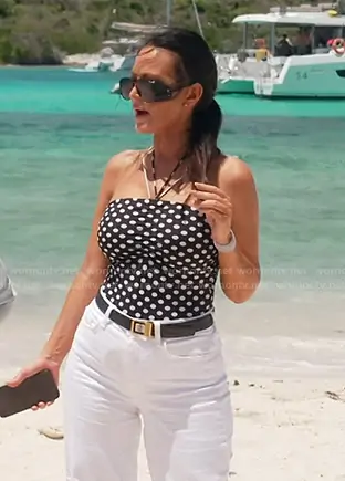 Lisa Barlow on The Real Housewives of Salt Lake City on Bravo was spotted wearing this polka dot swimsuit on The Real Housewives of Salt Lake City on episode 'Loose Lips Sink Friend Ships' (6x08) in Nov 2025. Lisa's Swimsuit is the Polka-dot Swimsuit by Saint Laurent . Lisa's Sunglasses is the Leon Pilot-frame Sunglasses by Saint Laurent.