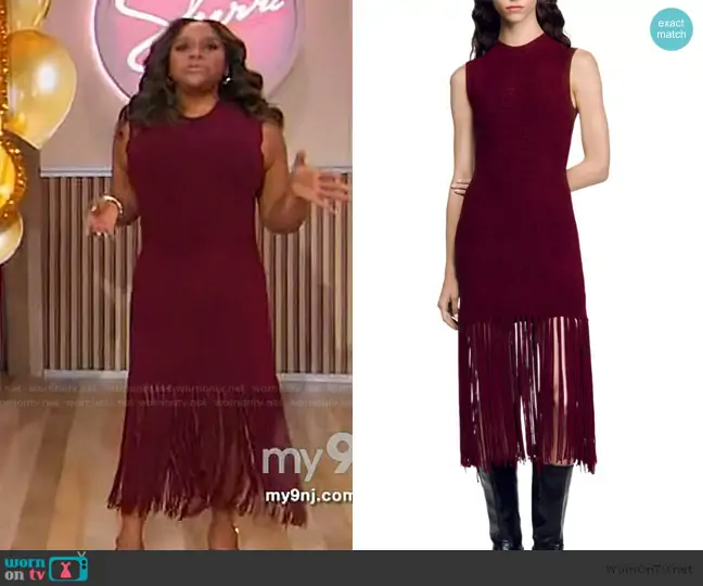 Sherri Shepherd on Sherri on FOX was spotted wearing this burgundy fringe hem dress on Sherri on Nov 05 2025's episode. Sherri's Dress is the Carlita Velvet Knit Dress by Sandro.