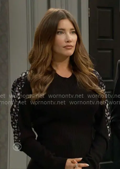 Steffy Forrester (played by Jacqueline MacInnes Wood) on The Bold and the Beautiful on CBS was spotted wearing this black sweater with printed panel on The Bold and the Beautiful on Nov 05 2025's episode. Steffy's Sweater is the Toska Sweater by Dries van Noten.